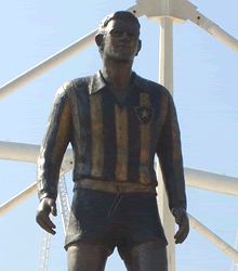 Biografia - Manuel Francisco dos Santos (28/10/1933-20/1/1983) nasce em Pau Grande e desde criança se destaca em peladas de futebol, sempre como ponta-direita. Aos 19 anos começa a jogar no Botafogo carioca. Apesar das pernas tortas, faz dribles rápidos e desconcertantes que se tornam sua característica mais marcante. Suas atuações geniais o transformam em mito e dão origem a histórias peculiares, quase sempre sem confirmação, como a de que chamava de João todos os zagueiros encarregados de marcá-lo. Em 1955 é convocado para a seleção brasileira e participa da conquista das Copas da Suécia, em 1958 (na qual é eleito o melhor ponta-direita da competição), e do Chile (1962).