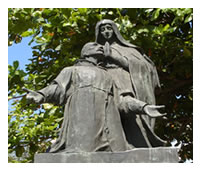 Biografia - Francisco nasceu em Assis, cidade de Úmbria, no ano 1182. Depois de uma juventude irrequieta e mundana, voltou-se para uma vida religiosa de completa pobreza, fundando a ordem mendicante dos Frades Menores, mais conhecidos como Franciscanos, que renovaram o Catolicismo de seu tempo. Com o hábito da pregação itinerante, quando os religiosos de seu tempo estavam mais ligados aos mosteiros rurais, e com sua crença de que o Evangelho devia ser seguido à risca, imitando-se a vida de Cristo, desenvolveu uma profunda identificação com os problemas de seus semelhantes e com a humanidade do próprio Cristo. Sua atitude foi original também quando afirmou a bondade e a maravilha da Criação, quando se dedicou aos mais pobres dos pobres, e quando amou todas as criaturas chamando-as de irmãos. Alguns estudiosos afirmam que sua visão positiva da natureza e do homem, que impregnou a imaginação de toda a sociedade de sua época, foi uma das forças primeiras que levaram à formação da filosofia da Renascença.